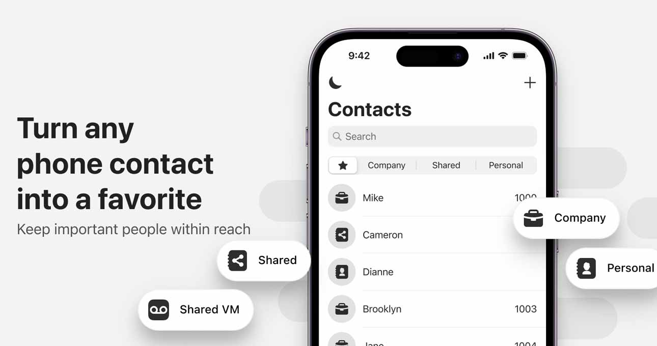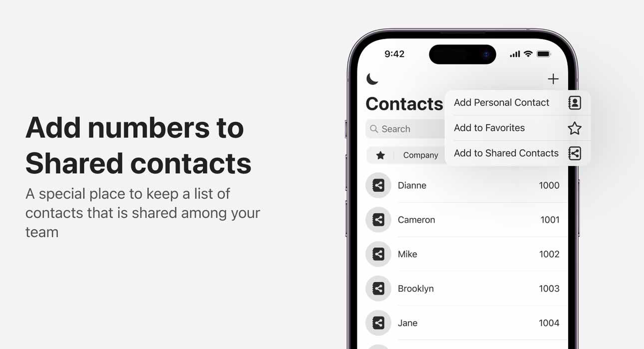In the past, only account administrators could add contacts to the Shared contact list through the Ooma Office management portal. Today any user authorized by the account administrator can add contacts to the shared contact list directly in the Ooma Office mobile app. Highlight a contact from your Favorites, Company, or Personal list and tap on the plus sign at the top of the screen. Then select Add to Shared Contacts.
