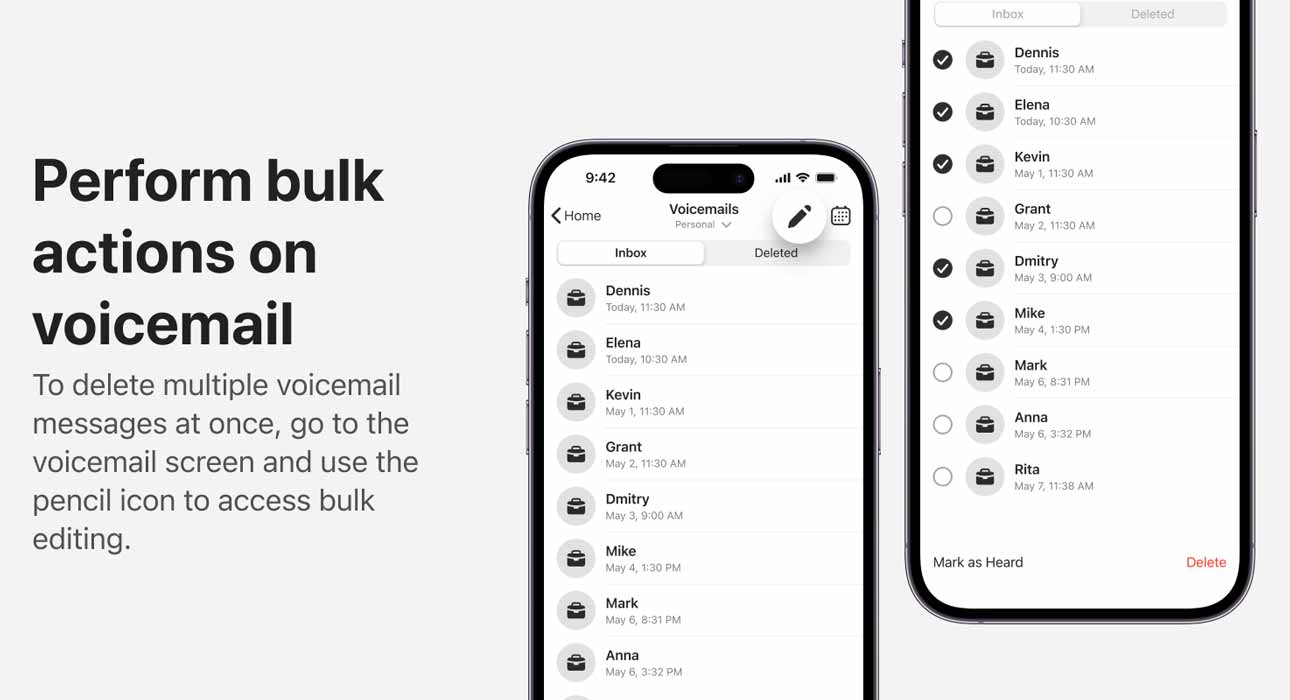 Instead of having to delete your voicemail message one by one, go to your voicemail screen and tap on the pencil, which turns into a bulk editing tool. You’ll be able to check every voicemail you want to delete or mark as read.