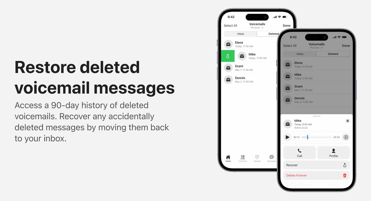 Go to your deleted voicemails and you’ll see a 90-day history. There, you’ll be able to recover any that were deleted by mistake and move them to your inbox. You can also listen to any you’re unsure about and decide to keep or delete forever.