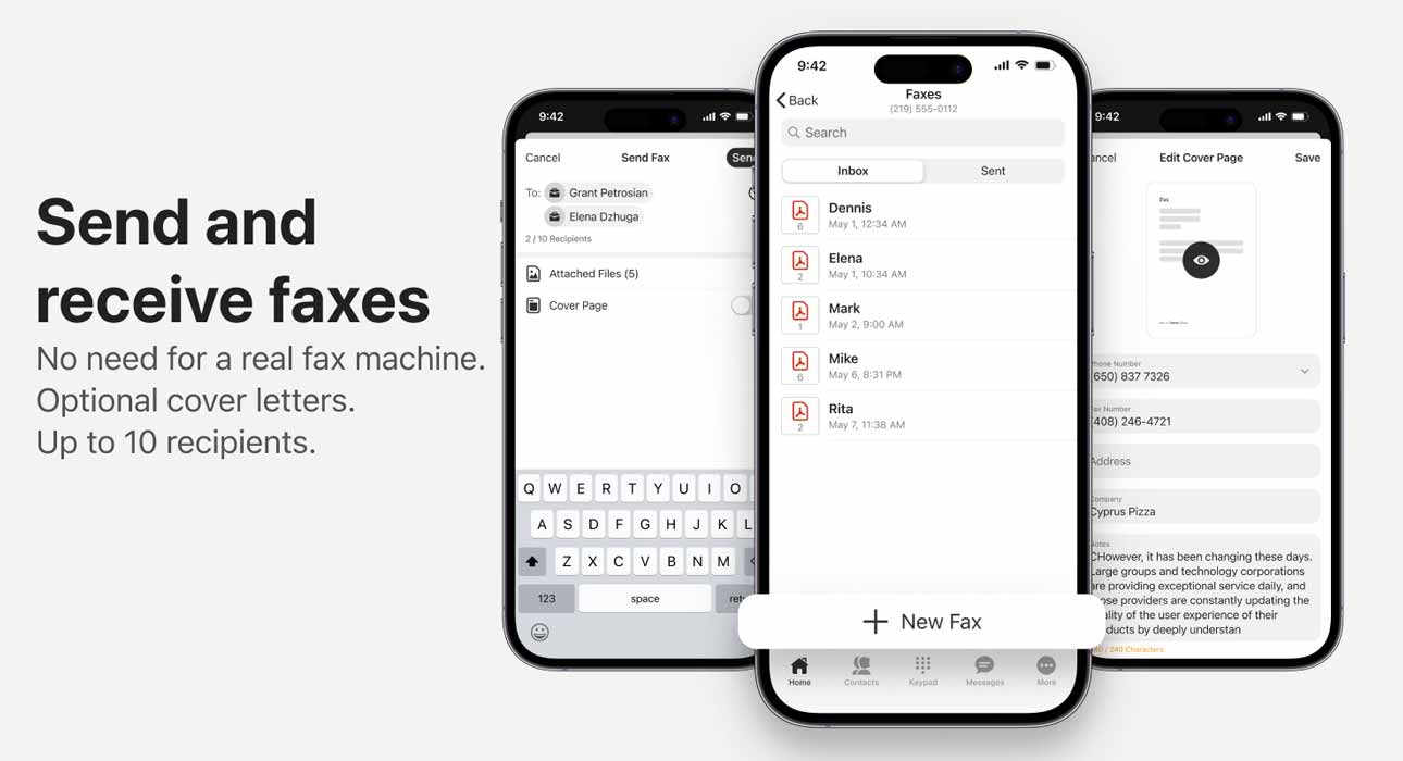 You don’t have to watch an actual fax machine slowly push out pages to receive a fax thanks to the Ooma Office mobile app. But even greater is the ability to create a cover letter and send a fax to up to 10 recipients. Just select a contact, attach a document or photo from your smartphone, write your cover letter in the text box and hit the SEND button.